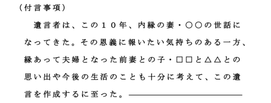 例えば、妻に先立たれ今内縁の妻のいる遺言者が、内縁の妻に5分の3、前妻との子2名に各5分の1ずつ財産を与える遺言書を作成した場合、次のような付言事項が考えられます。