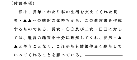 例えば、遺言者が、全財産を同居している長男に相続させるという遺言書を作成した場合、次のような付言事項が考えられます。