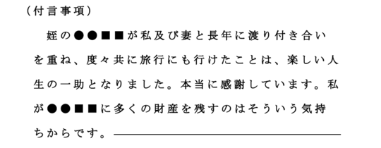 例えば、妻に先立たれ子のいない遺言者が、親交の深い姪の1人に多くの財産を与える遺言書を作成した場合、次のような付言事項が考えられます。