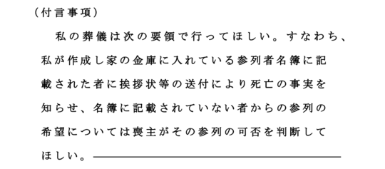 例えば、遺言者が作成した名簿の人のみ自身の葬儀を行ってほしい場合、次のような付言事項が考えられます。