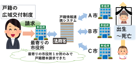 戸籍の広域交付制度とは、本籍地以外の市区町村の窓口でも、戸籍証明書や除籍証明書等を請求することができるようになるという制度のことです。