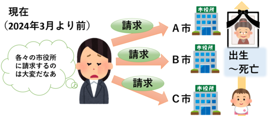 そのため、相続人である長女は、A市、B市、C市全ての市区町村役場に戸籍の請求をしなければならず、大きな負担となります。