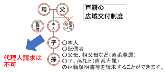戸籍の広域交付制度による請求者としては、本人、直系尊属(親、祖父母等)、直系卑属(子、孫等)、配偶者に限られます。