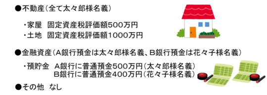 すなわち、遺言者①の山田太々郎は不動産は自宅としての居宅及び土地のみを有しており、評価額は家屋500万円、土地1000万円の固定資産税評価額です。