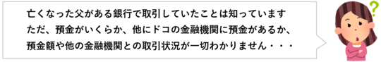 では、亡くなった人がどの金融機関(銀行や信用金庫等)と取引しているかさえわからない場合はどうでしょうか。