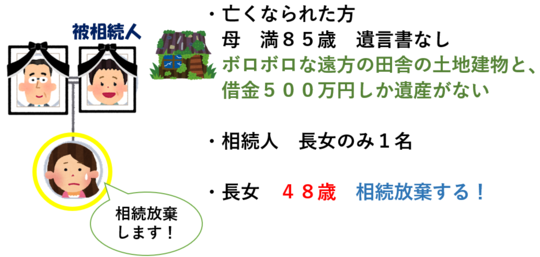 そこで、長女としては、田舎の土地建物の管理責任と借金から逃れるため、相続放棄することにしました。