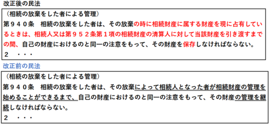 上の条文は、相続放棄後の管理責任の改正後の条文と改正前の条文です。