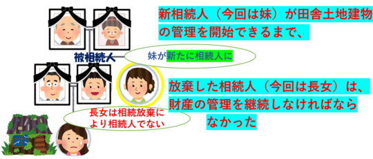 このように、新相続人(今回は妹)が田舎土地建物の管理を開始できるまで、放棄した相続人(今回は長女)は、財産の管理を継続しなければなりませんでした。