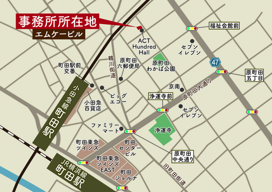 小田急町田駅東口改札出て徒歩5分。南口改札出ても徒歩5分で着きます。
